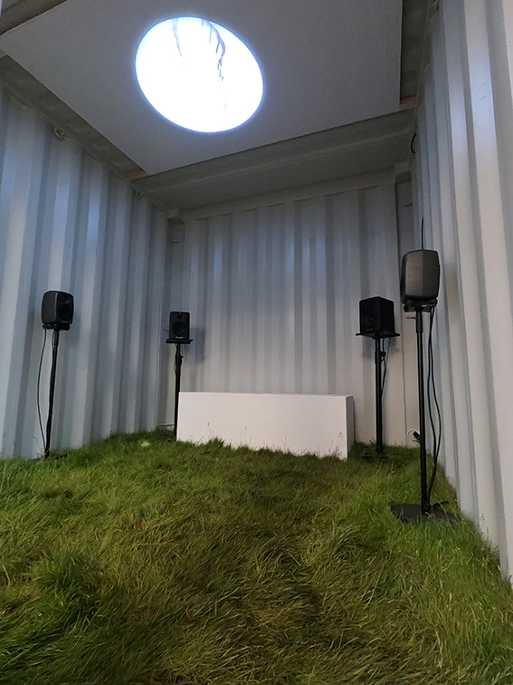Installation based work looking at the tension between activity/inactivity, stress/relaxation. Incorporating moving image work edited through a custom made movement detection filter designed to respond to the movement of the chest while breathing. Accopmanied by the sound of breath slowing down and becoming calm after strenuous activity. Creation of a meditative environment using live grass flooring and a space that is designed to accomodate only one person at a time.